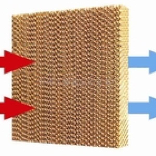 Our water evaporative cooling pad for poultry pig farm greenhouse has one layer of thin water film on the surface of corrugated fiber paper. When the outside hot air pass through the paper, water on the thin film absorb heat in the air and then evaporate into vapor, and the cool air can enter the room. It is a good use of the principle of water evaporation temperature decreases.