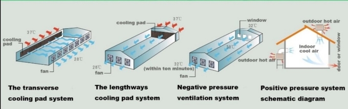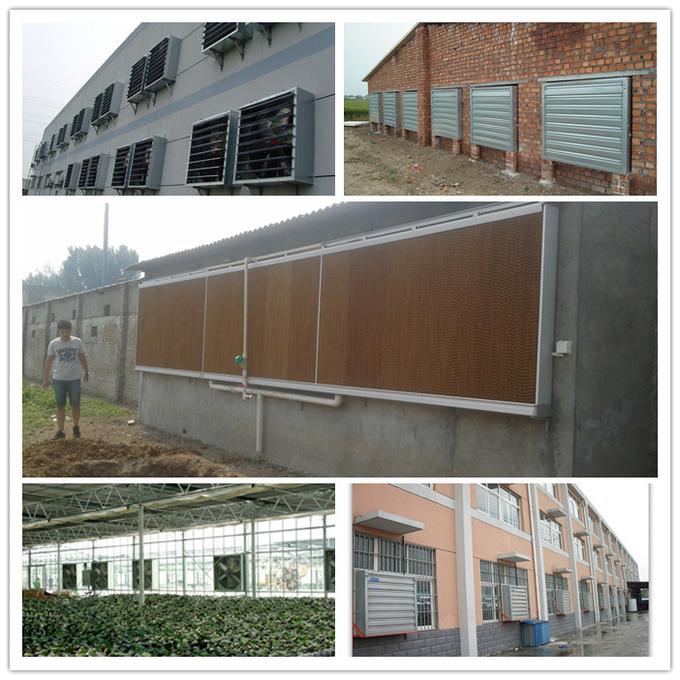 Our water evaporative cooling pad for poultry pig farm greenhouse has one layer of thin water film on the surface of corrugated fiber paper. When the outside hot air pass through the paper, water on the thin film absorb heat in the air and then evaporate into vapor, and the cool air can enter the room. It is a good use of the principle of water evaporation temperature decreases.