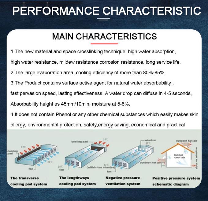 1. Our water evaporative cooling pad wet curtain use new material and space crossing linking technology, high water absorbability ,high water-resistance, anti-mildew and long service life