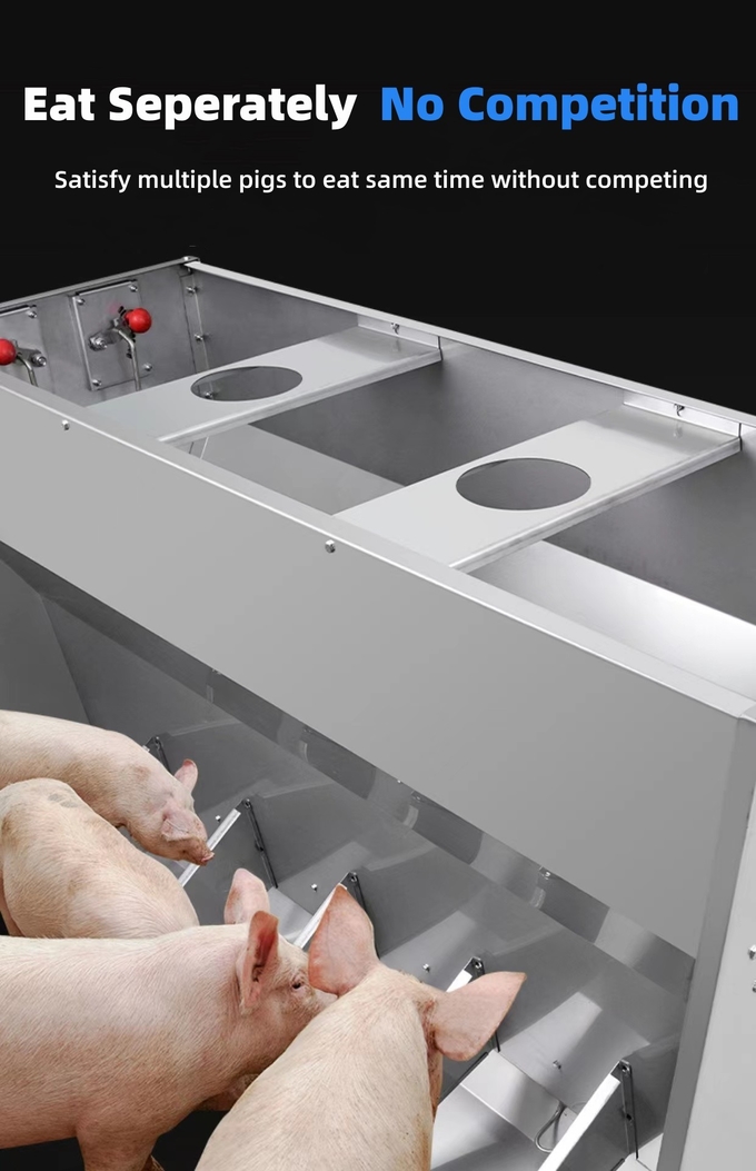 Livestock feeding equipment SUS 304 pig feeder is suitable for weaning, fattening and gilt pig houses, and can feed multiple pigs at the same time. The built-in regulator can adjust the feeding speed according to the situation of pigs to ensure that the feed is fresh and not wasted. Automatic drinking equipment can be configured.